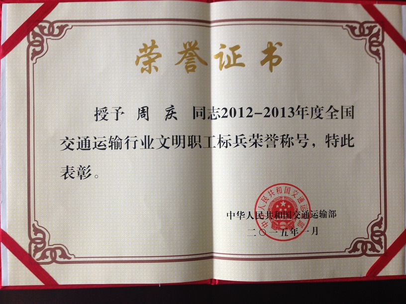 駕駛員周慶榮獲“全國交通運輸系統(tǒng)勞動模范”稱號
