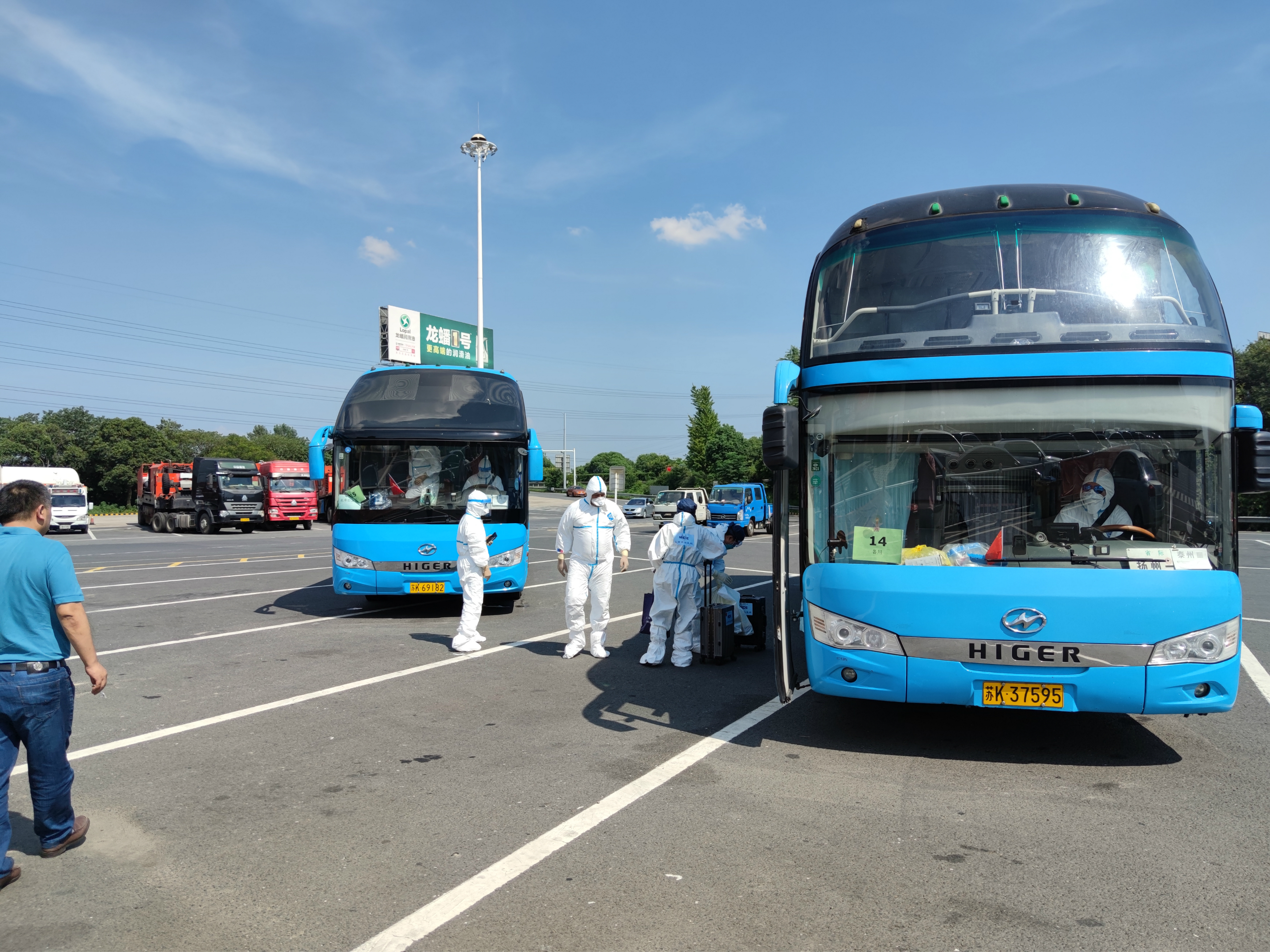 當(dāng)天氣溫達(dá)到36度,機(jī)坪溫度更是超過50度,在這種酷暑下,駕駛員全身穿戴密閉的防護(hù)服,對行車安全是巨大的挑戰(zhàn)。龔宇峰董事長趕赴現(xiàn)場,再次對駕駛員抗高溫,保安全進(jìn)行了交代。中午11時(shí)40分,首批車輛從機(jī)場出發(fā),至14時(shí)11分最后一批車出發(fā),將二百多名境外返揚(yáng)人員運(yùn)送至相關(guān)酒店。16時(shí)50分,所有車輛圓滿完成任務(wù),回到指定地點(diǎn),接受消毒和檢測。