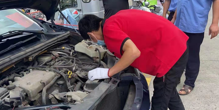 8月14日中午13.00,接到廠部電話通知,因疫情來(lái)?yè)P(yáng)州支援的南京公務(wù)車(chē)輛因水溫過(guò)高而無(wú)法行駛停在⻄區(qū)大潤(rùn)發(fā)停車(chē)場(chǎng) ,得知情況后許學(xué)仁又主動(dòng)請(qǐng)纓前去搶修,他立即與車(chē)主取得了聯(lián)系并向車(chē)主詢(xún)問(wèn)車(chē)輛故障現(xiàn)象,隨后和同伴馮琪準(zhǔn)備好工具便出發(fā)。趕到現(xiàn)場(chǎng)后,他們對(duì)⻋輛進(jìn)行了檢修,從而發(fā)現(xiàn)水箱爆裂導(dǎo)致水溫升高,隨即聯(lián)系配件供應(yīng)商,但因疫情和道路管控原因配件無(wú)法送達(dá),許學(xué)仁自己開(kāi)車(chē)去尋找配件,一同前往的機(jī)修工馮琪便開(kāi)始對(duì)水箱進(jìn)行拆解,兩邊同時(shí)進(jìn)行著,展開(kāi)了一場(chǎng)與時(shí)間賽跑的“搶修戰(zhàn)役”,當(dāng)回到救援地點(diǎn),水箱以拆解好等待安裝,他倆便開(kāi)始安裝,裝配完畢后開(kāi)始試車(chē)與檢查水溫,水溫正常且風(fēng)扇完美轉(zhuǎn)動(dòng),車(chē)輛得已運(yùn)行,他兩露出了開(kāi)心的笑容。