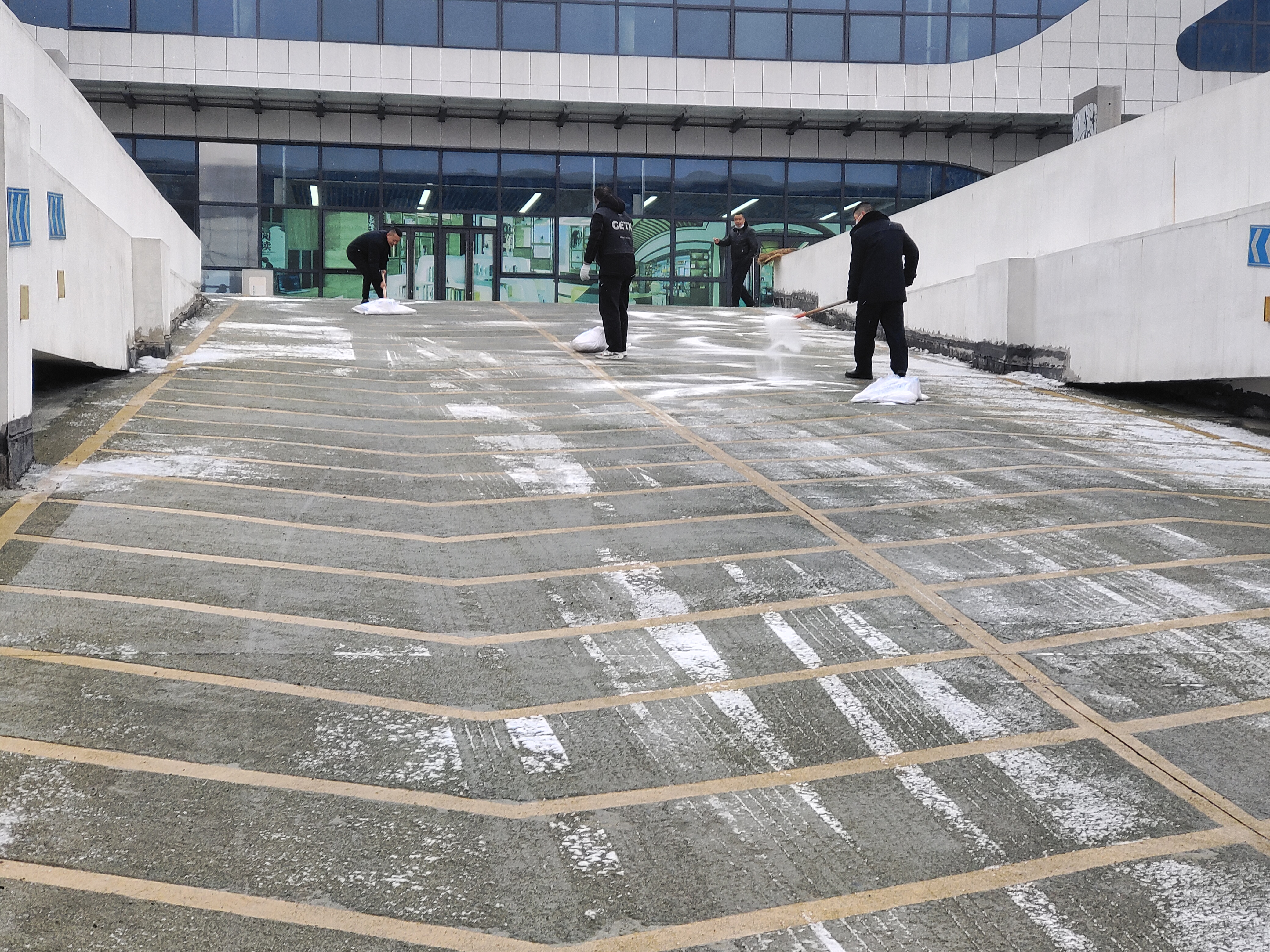 在揚汽修理廠,為防止廠區(qū)地面冰凍,各部門、班組迅速對全廠范圍內(nèi)的積雪進行清除,對廠區(qū)內(nèi)主干道、例保通道、倉房陰面等區(qū)域噴撒融雪劑,為例保通道鋪上防滑草墊,確保廠區(qū)道路暢通。