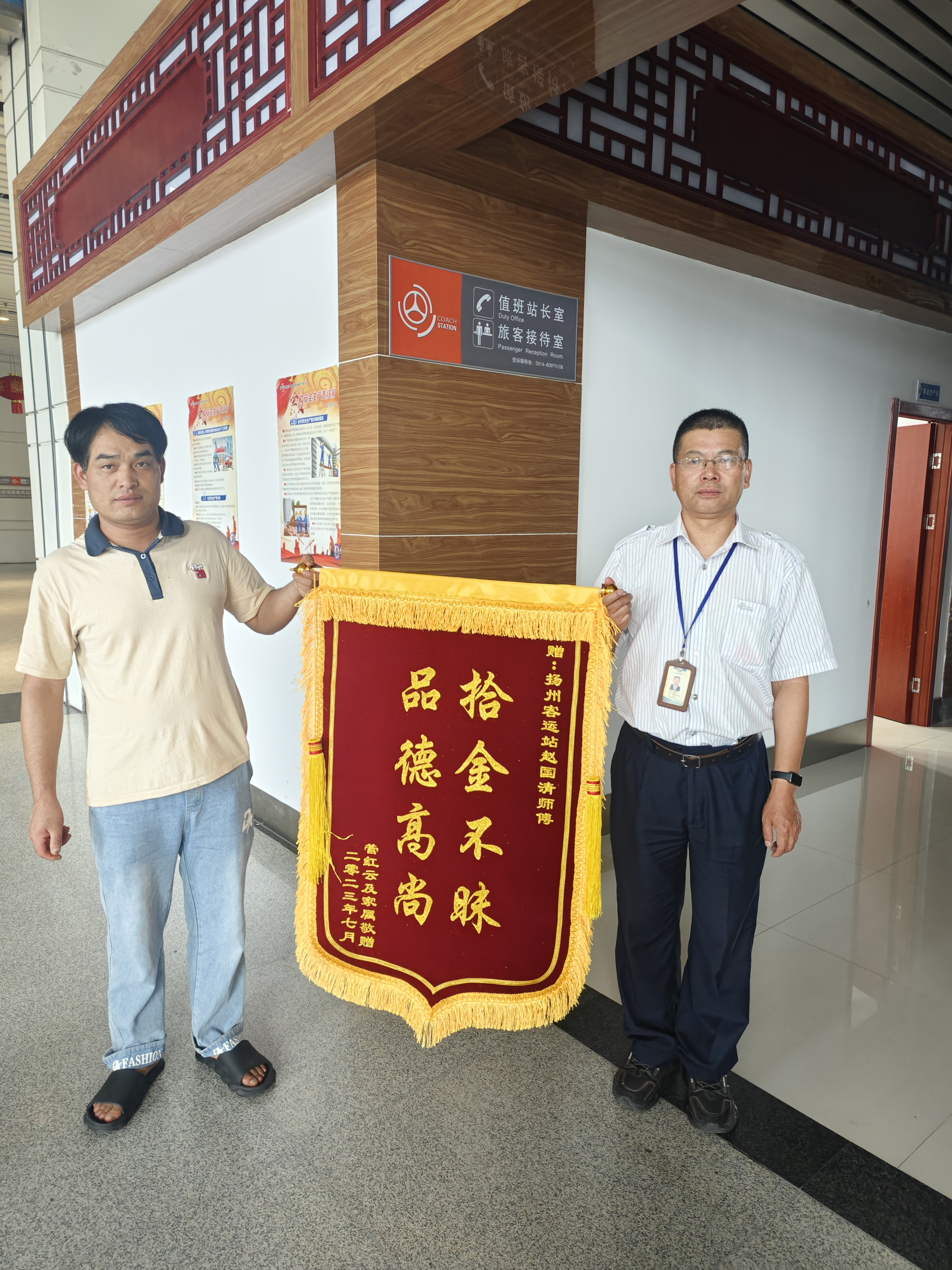7月18日,失主管先生專門制作了一面“拾金不昧,品德高尚”的錦旗到揚州汽車站值班室對好人趙國清表示感謝。接下來,揚汽集團站務(wù)中心將繼續(xù)以黨建為引領(lǐng),以榜樣為鏡,向榜樣看齊,充分發(fā)揮先鋒模范帶頭作用,深入推動“星級服務(wù),溫馨之旅”黨建微品牌工作走深走實。