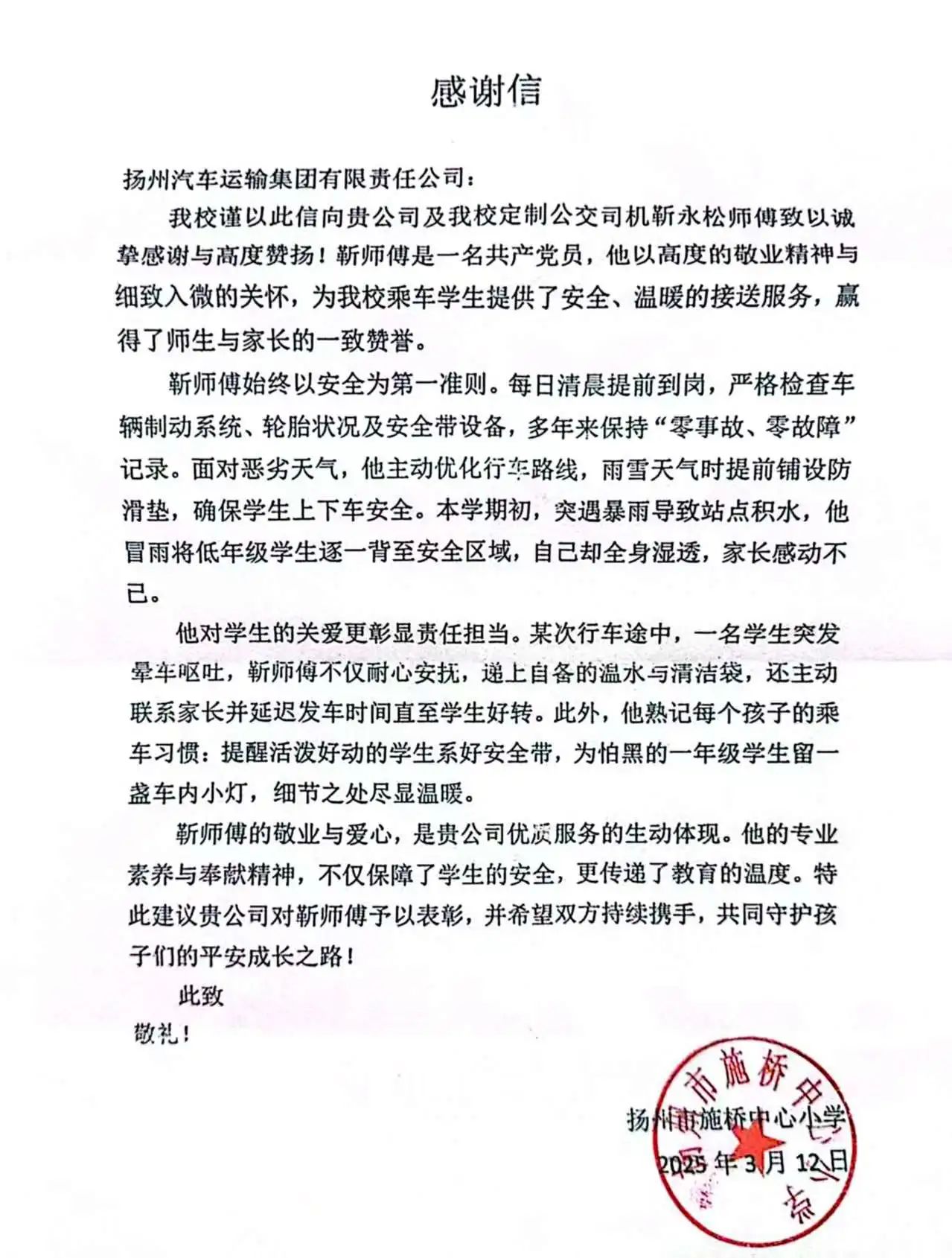 紙短情長 愛有回響丨揚汽集團校車司機優(yōu)質服務獲學校點贊